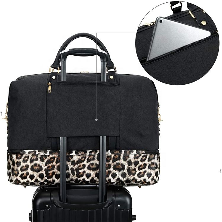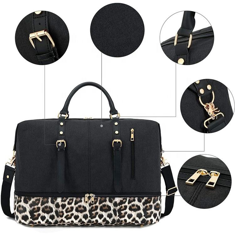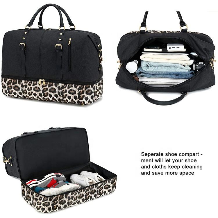 豹纹印花周末包女士时尚行李袋手提包隔夜包皮革 & 帆布豪华旅行周末包